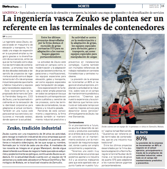 Among the headlines we can read “Zeuko, industrial tradition“, “Zeuko engineering is relaunched” and “Zeuko engineering diversifies into predictive maintenance“. In the articles, we review our activity and the industrial tradition of more than two decades, acting as the R + D + i department of multiple companies. Also important is the growth forecast, estimated at 80% of the business, and the expansion of activity in the industry.